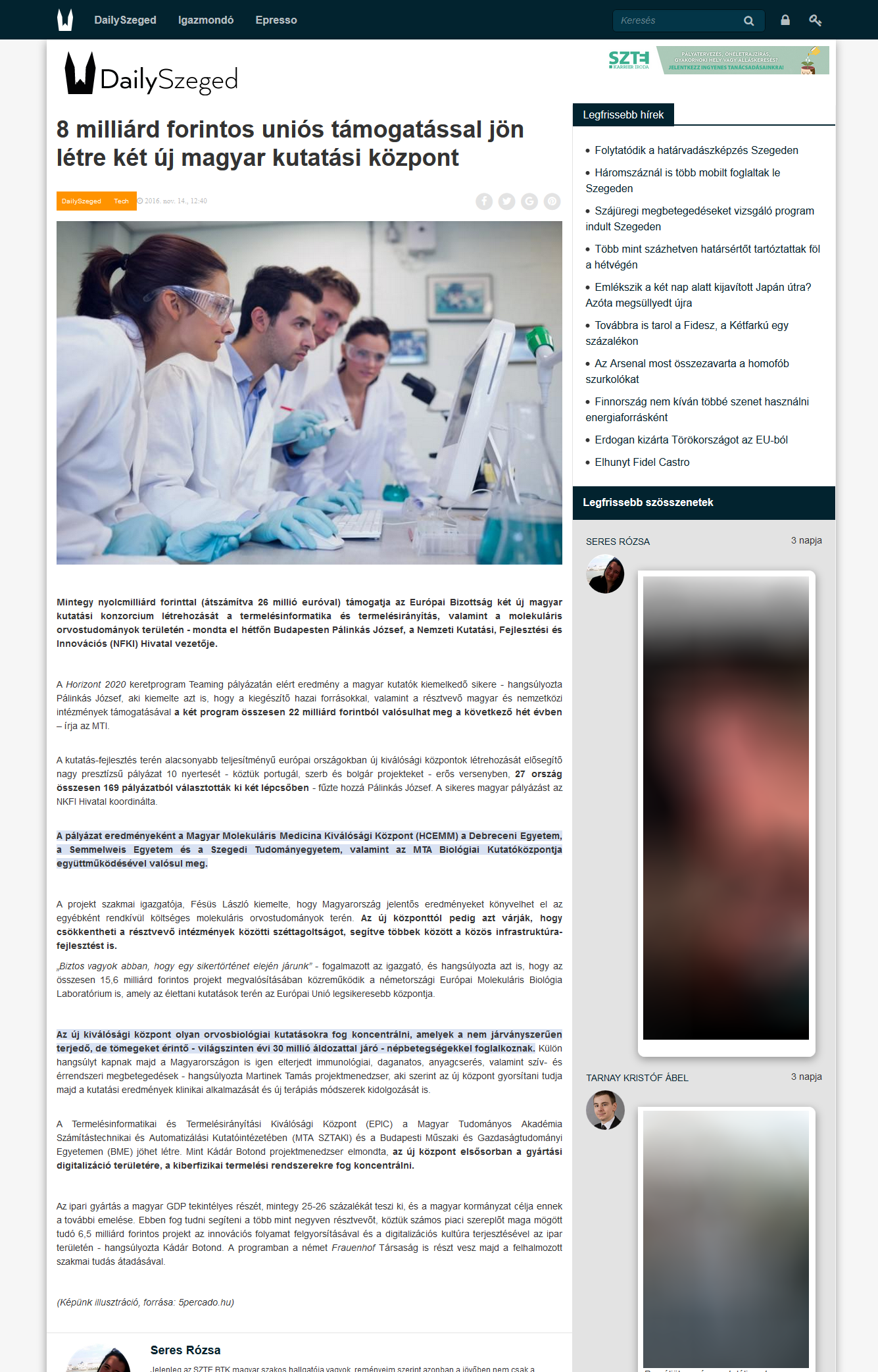 8 milliárd forintos uniós támogatással jön létre két új magyar kutatási központ