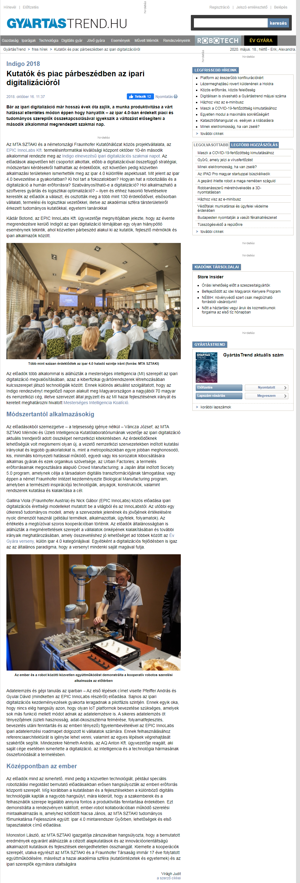 Az MTA SZTAKI és a németországi Fraunhofer Kutatóhálózat közös projektvállalata, az EPIC InnoLabs Kft. termelésinformatikai kiválósági központ október 10-én második alkalommal rendezte meg az Indigo elnevezésű ipari digitalizációs szakmai napot. Az előadások alapvetően két csoportot alkottak, előbb a digitalizációval összefüggő stratégiai, módszertani kérdésekről hallhattak az érdeklődök, ezt követően pedig közvetlen alkalmazási területeken ismerhették meg az ipar 4.0 különféle aspektusait. Mit jelent az ipar 4.0 bevezetése a gyakorlatban? Ki hol tart a fokozatokban? Hogyan hat a robotizálás és a digitalizáció a humán erőforrásra? Szabványosítható-e a digitalizáció? Hol alkalmazható a szoftveres gyártás és logisztikai optimalizáció? – ilyen és ehhez hasonló felvetésekre keresték az előadók a választ, és osztották meg a több mint 130 érdeklődővel, elsősorban vállalati, termelési és logisztikai vezetőkkel, illetve az akadémiai szféra társterületeiről érkezett tudományos kutatókkal, egyetemi tanárokkal