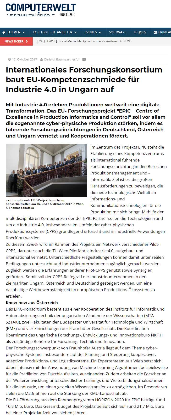 This press release was published in “Computerwelt” in Austria. After the second consortium meeting held in Vienna The EPIC project was introduced to the Austrians. The article reports on: the central issue (establishment of the competence centrum), one of the main aims (network of pilot CPPS factories), consortial partners and the main financial data of the project and moreover on planned contribution and current activities of FhA.